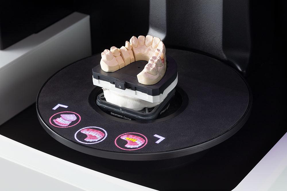 Stümpfe, die bei secondDie und singleDie freigestellt werden sollen, beleuchtet der Projektor auf dem Modell im Innenraum. Modell und Objekthalter können somit im Scanner verbleiben, das zeitintensive Prüfen, welche Zähne entnommen werden müssen, entfällt. Beim 2D-Scan zeigen die Illuminationen die korrekte Farbangabe der Rekonstruktionstypen aus exocad DentalCAD® an. Bei anderen Arbeitsprozessen werden ebenfalls Hilfestellungen auf die System- oder Universalplatte projiziert. Ein falsches Einsetzen von Artikulatoren oder Abdrücken kann so ausgeschlossen werden.